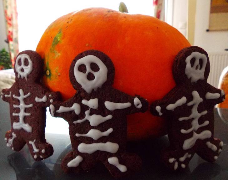 - Décorez les bonhommes en vous servant d’un stylo à pâtisserie ou une poche à douille et dessinez les squelettes sur les biscuits.