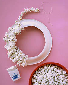 Entourez la couronne avec les guirlandes de popcorn de façon à recouvrir complètement le support, en veillant à ce que les pop-corn soient assez serrés. N’oubliez pas de fixer les extrémités des guirlandes.