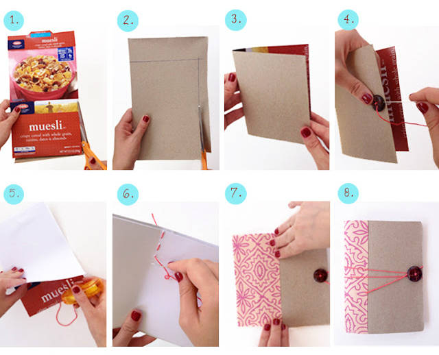 - – Pour faire la couverture du carnet, découpez la boite de céréales aux dimensions souhaitées pour votre carnet. Ensuite, pliez le carton en deux en mettant la partie colorée à l’intérieur.
