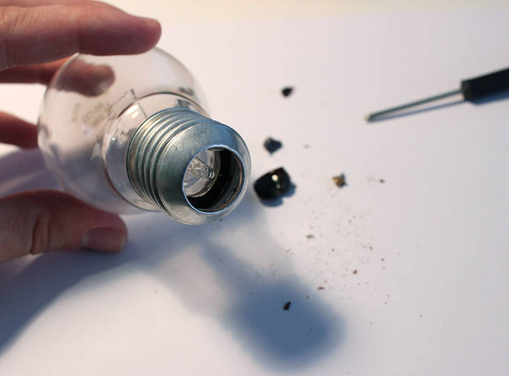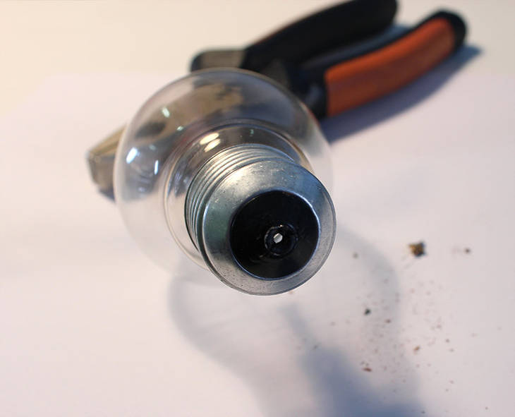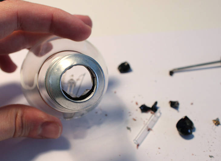 – Une fois la partie noire fissurée, cassez le tube en verre se trouvant à l’intérieur de l’ampoule à l’aide d’une pince, une clé d’Allen ou un tournevis.
