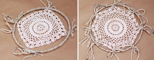 Étirez le napperon et utilisez des fils de laine pour attacher les bords du napperon au cerceau.