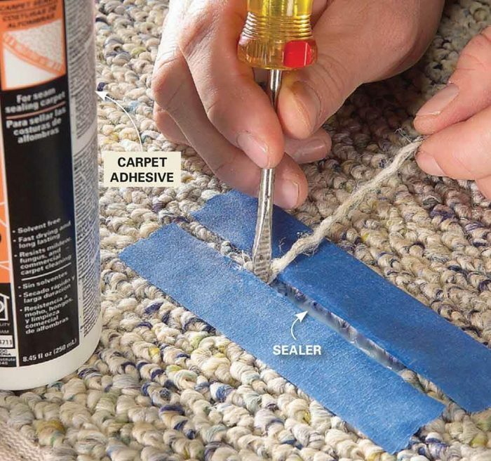 Si un fil est tiré sur votre moquette (surtout les moquettes bouclées), ne tirez surtout pas dessus ! Coupez simplement le fil qui dépasse au ras de la moquette avec une paire de ciseaux. Pour éviter que le trou ne s’agrandisse, protégez la zone avec du ruban de masquage et déposez une petite goutte de colle spéciale moquette dans la rainure avec la pointe d’un tournevis.