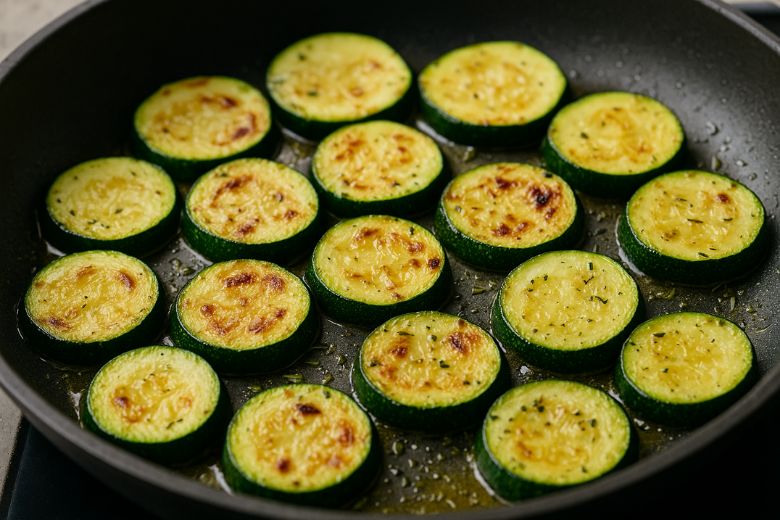 Lavez, essuyez et coupez les courgettes en tranches d’environ 1 cm d’épaisseur. Faites-les revenir dans une poêle avec un filet d’huile d’olive pendant 5-10 minutes jusqu’à ce qu’elles soient fondantes. Salez, poivrez et ajoutez les herbes de Provence.
