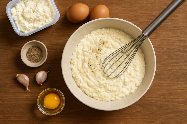 Dans un bol, mélangez la ricotta, les œufs, l’ail haché, du sel et du poivre.