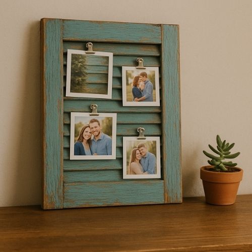 Les volets peuvent être transformés en superbes cadres photo rustiques. C’est une excellente façon de réutiliser ces vieux volets traînant dans votre grenier. Tout ce que vous avez à faire est de poncer et peindre les volets, puis d’y attacher vos photos préférées.